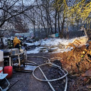 Am frühen Mittwochmorgen wurden wir von der Leitstelle zu einem Wohnwagenbrand alarmiert. Bereits bei der Anfahrt war der helle Feuerschein im Morgengrauen zu sehen. An der Einsatzstelle bestätigte sich die Meldung, dass ein Wohnwagen im Vollbrand stand. Schnell wurde mit einem C-Rohr die weitere Ausbreitung auf umliegendes Strauchwerk verhindert. Anschließend wurde unter schwerem Atemschutz das Feuer zunächst mit Wasser gelöscht und anschließend mit Schaum abgedeckt. Nach gut 2 Stunden konnten wir uns wieder einsatzbereit im Standort melden.