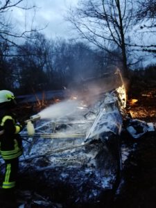 Am frühen Mittwochmorgen wurden wir von der Leitstelle zu einem Wohnwagenbrand alarmiert. Bereits bei der Anfahrt war der helle Feuerschein im Morgengrauen zu sehen. An der Einsatzstelle bestätigte sich die Meldung, dass ein Wohnwagen im Vollbrand stand. Schnell wurde mit einem C-Rohr die weitere Ausbreitung auf umliegendes Strauchwerk verhindert. Anschließend wurde unter schwerem Atemschutz das Feuer zunächst mit Wasser gelöscht und anschließend mit Schaum abgedeckt. Nach gut 2 Stunden konnten wir uns wieder einsatzbereit im Standort melden.