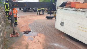 Hydraulikschlauch an einem Kran-LKW geplatzt. Ca. 20-30 Ltr. Hydrauliköl ausgetreten.Fahrer hat bereits Gullieinläufe abgedichtet. Öl mit Bindemittel abgebunden und kontamiertes Ölbindemittel aufgenommen. Zweites mal abgestreut und wieder aufgenommen. Eine Fachfirma zur Straßenreinigung und den GW-Öl der FTZ zur Einsatzstelle bestellt. Die FTZ hat die 3 Wannen mit Ölverschmutzen Bindemittel aufgenommen und entsorgt und uns neues Bindemittel dagelassen. Die Fachfirma hat die Straße gereinigt.